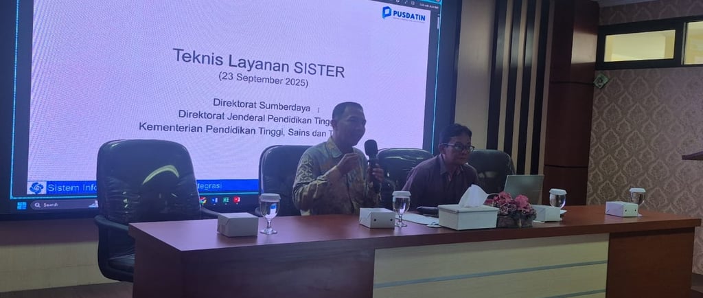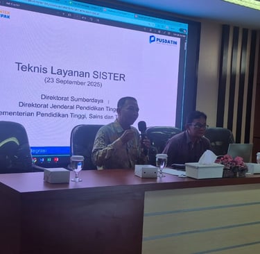 Salah satu sesi penting dalam kegiatan ini adalah pemaparan mengenai Sistem Informasi Sumber Daya Terintegrasi (SISTER) yang disampaikan oleh Jims Pistavia Anugrah, Analis Kebijakan Ahli Muda dari Pusat Data dan Teknologi Informasi (Pusdatin), Sekretariat Jenderal Kementerian Pendidikan Tinggi, Sains, dan Teknologi (Kemdiktisaintek).